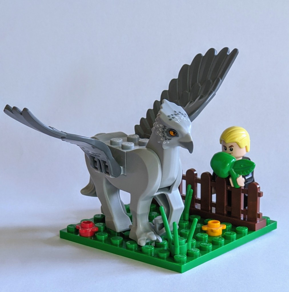 Small set: Small grass field with fence on one side and small tree – the perfect setting for Hagrid to give his lesson. Minifigures could include: Buckbeak as well as Harry Potter, Hagrid and Draco Malfoy (with an apple as per the movie to please the drapple fans). It should also include a copy of the Monster Book of Monsters.
