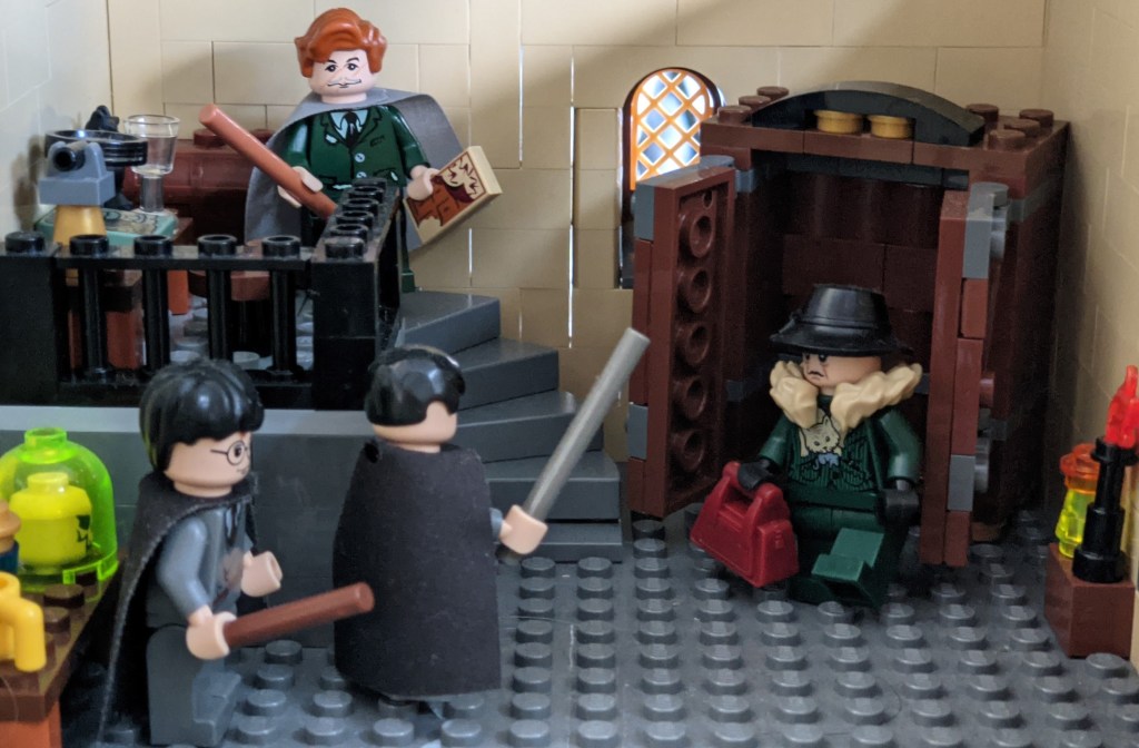 Large set: This set focuses on some of the scenes from The Goblet of Fire. Long overdue is a decent library (including librarian), where Harry and Hermione can look for ways to stay under water for an hour. It should also include a room with the Goblet of Fire, a closet where Rita Skeeter can interview Harry Potter, and Snape’s potion storeroom where Dobby found gillyweed for Harry. To make it a large set, it could also feature Dumbledore’s office and/or the Prefects bathroom, though both were in the Clocktower set from 2019. So I’d rather go with the Owlery, where Harry can ask Cho if she want to be his date for the Yule Ball. Minifigures could include: Harry Potter, Hermione Granger, Cho Chang, Dobby, Madam Irma Pince (the Librarian), Professor Snape and Professor Dumbledore.