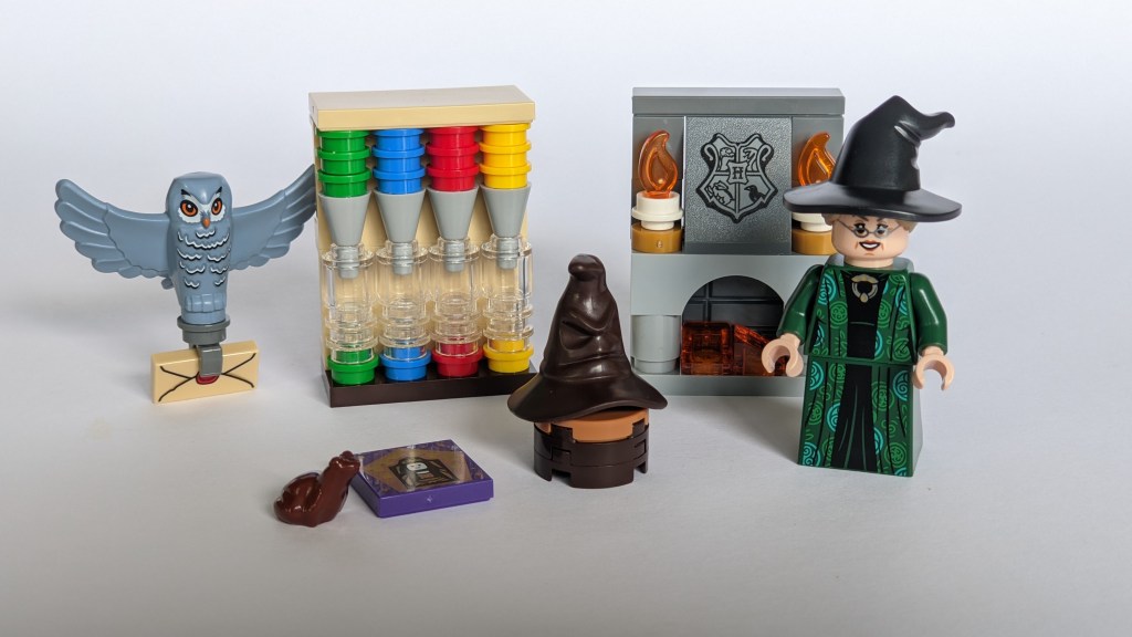 Also note the sorting hat and the grey-blue owl with the spread-out wings – the first appearance of that owl mould in this colour (it is also found in the Hogwarts Hospital Wing set).