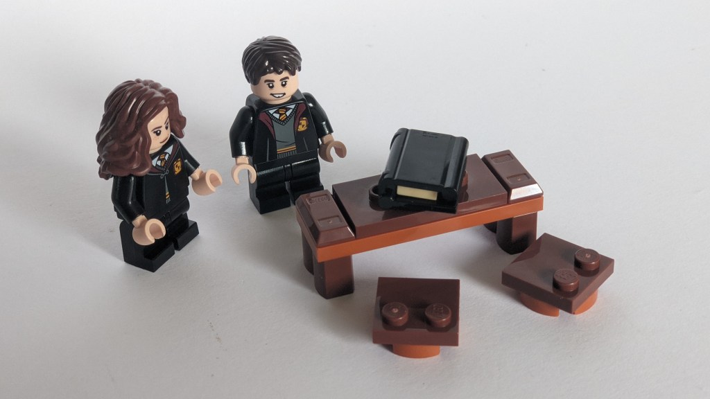 Bag 1 gives you two of the figures (Hermione and Neville), the parts needed for a few small models and then get you started on the book cover. The small models are a desk with two chairs along with a text book for the class.