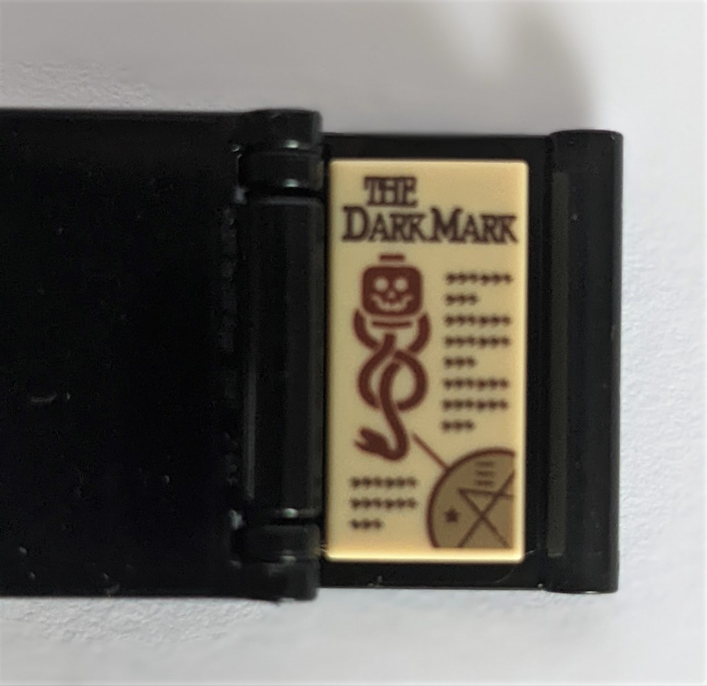 Each book in the series have had a unique tile listing a well-known charm or subject from the class in focus. In this case, the tile shows the Dark Mark, nicely made with LEGO minifigure skull head.