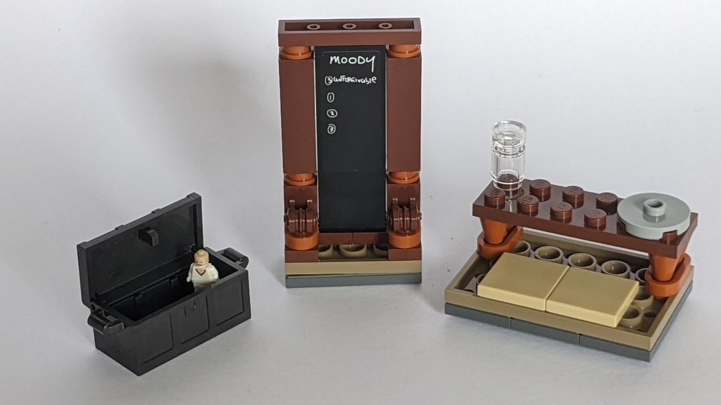 Next you build three small models – a chest with a micro “Madeye” figure inside, a blackboard where Alastor is about to list the three unforgivable curses, and a table to undertake experiments.