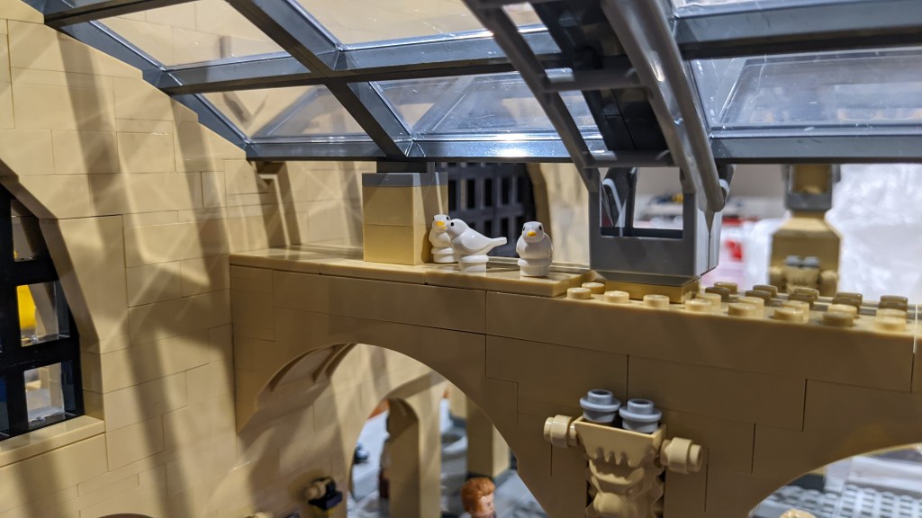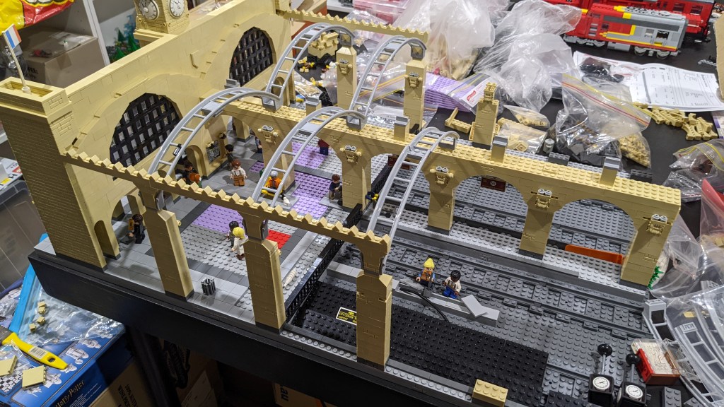 I will finish this post with a few photos giving an impression of the overall build. Here, most columns are now in place. I ran out of tan 2×4 bricks of all things, so a few of the side columns had to wait on the next order to arrive. It also gives a sneak peak into how the minifigures access Platform 9 ¾.
