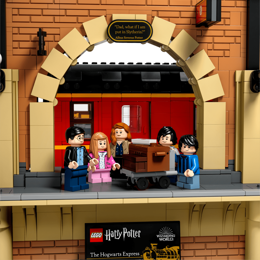The model also depicts the scene on Platform 9¾ at King’s Cross Station, where the adult Harry and Ginny wait with their children, Lily, James and Albus, ready for Albus’s first trip aboard the amazing Hogwarts Express. As for the the scenes in the train compartments, there is also a “quote” brick here.