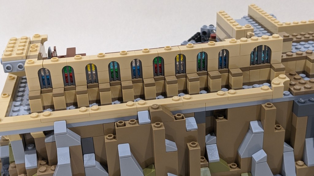 After that milestone, we temporarily move our attention to the forecourt, where the walls are quickly added. Small, printed glass panes add additional detail. As the photo shows, one appears to be missing, which simply represents that that is an exit (to the viaduct that will come much later). Another one is “missing” where the stairs from the boat house ends, to allow the students to enter the castle from there.