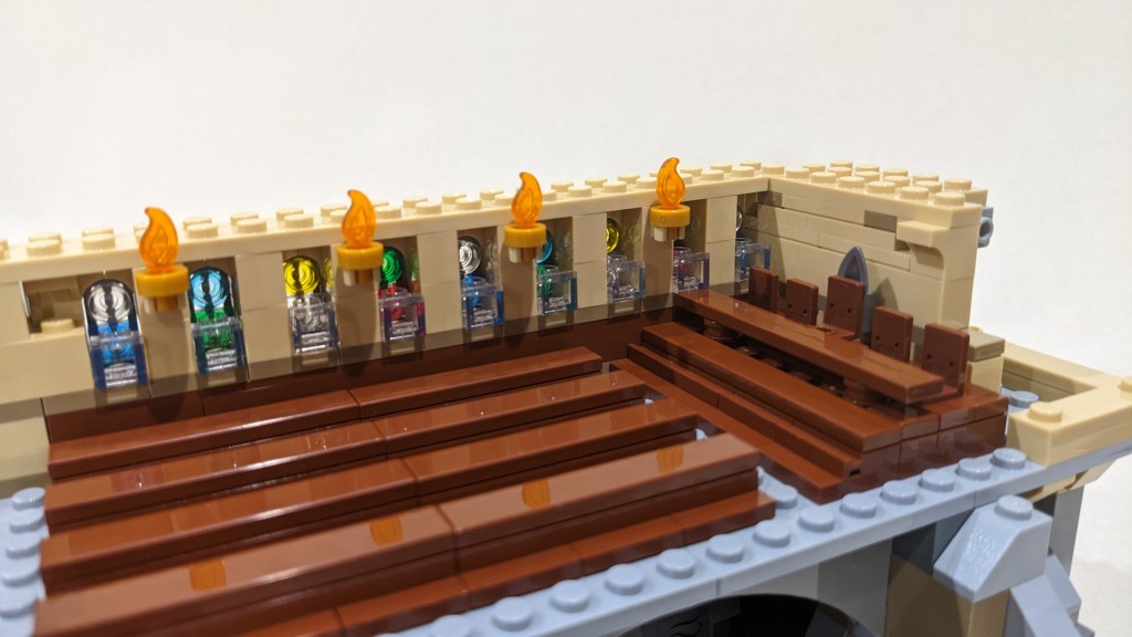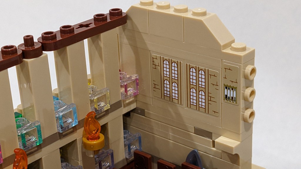 The inside of the hall is coming along nicely too – with the four house banners added (stickers of course). Overall, the Great Hall interior looks great. To the left of the photo below, we see all the “educational decrees” from the Umbridge year. It is a nice idea, but I don’t really like the use of the larger panel elements in exclusive sets like this.