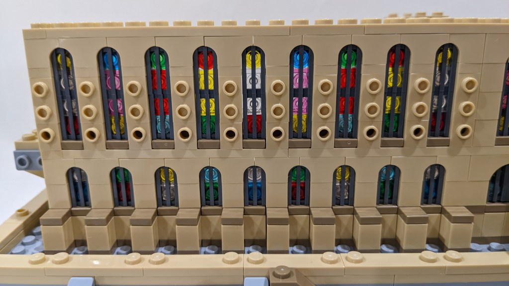 As seen below, we have started on the next row of stained windows. But I’ll bring the attention to the back wall. That is one of the few weak things I’ve found with this set. It annoys me that the “window stickers” are not centred on the wall, Nor are they centred with the chairs under the windows (or the door across the floor on the other side). So it doesn’t really align with a single thing, which would have been nice, though I also understand why that is not easy given the way it has been designed.