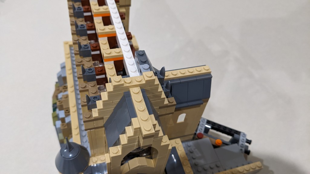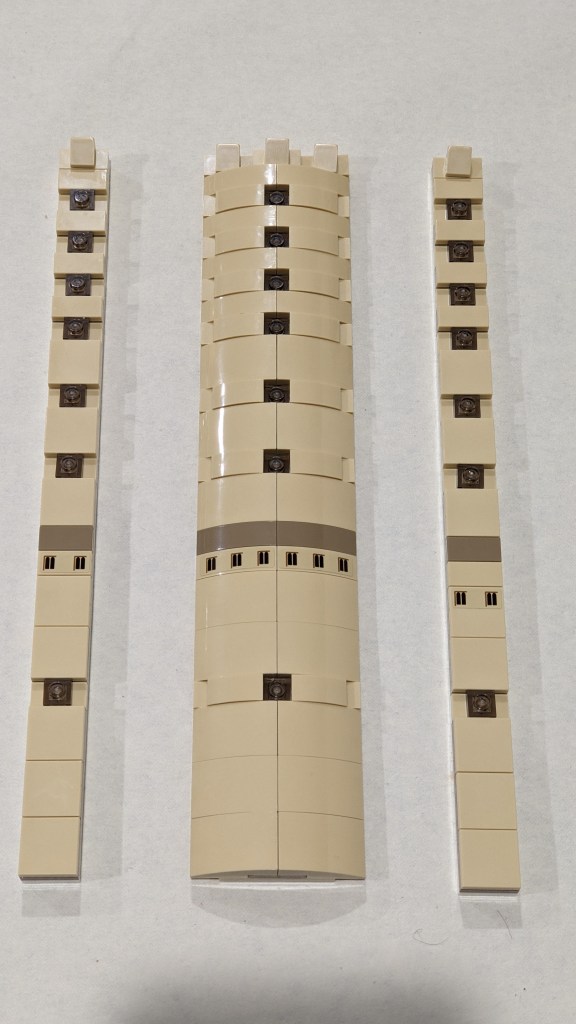While the tower interior was quickly built, the curved panels used for the sides don’t look that great. So we add a layer of curved slopes to the sides, to make it look more brick built. It works really well, but also takes up quite a few extra bricks.