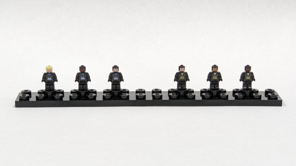 Firstly, we have four named Hogwarts students: Harry Potter, Hermione Granger, Ron Weasley and Draco Malfoy. The figures are really small, but with the help of the printing, you can still identify these based on their robes and hair colours (and glasses too for Harry).