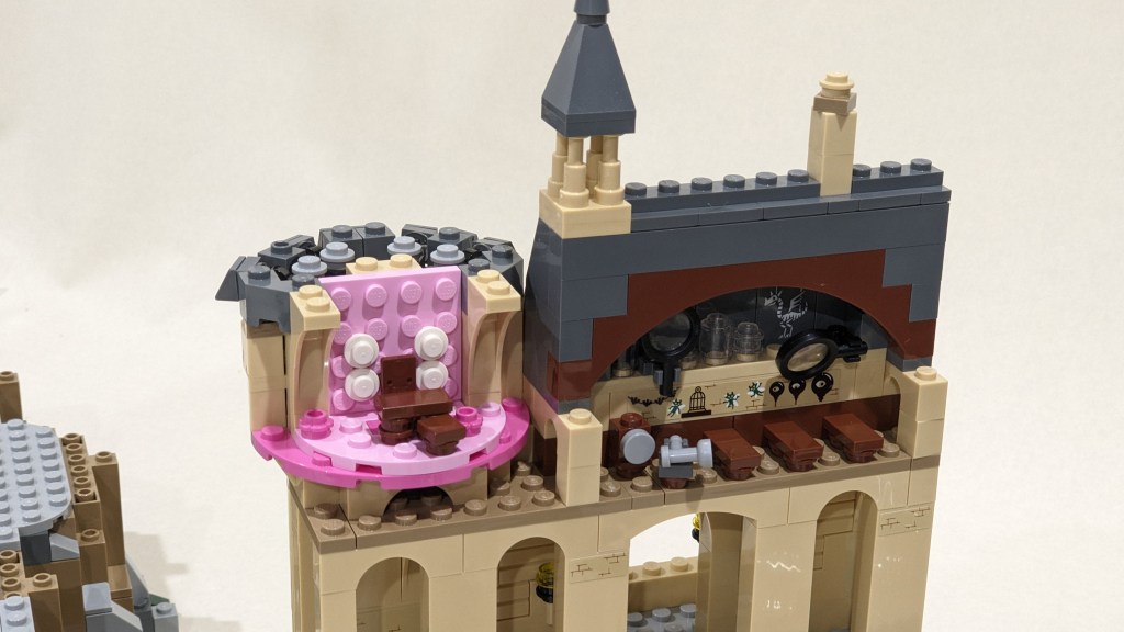 Next to the classroom, we then start building a tower room with Professor Umbridge’s office. The colour scheme is of course pink, with white round plates on the wall representing all her decorative plates with cat paintings. The desk and chairs (including one for Harry to sit on when repeatedly writing “I must not tell lies”) are particular well done for such a small scale.
