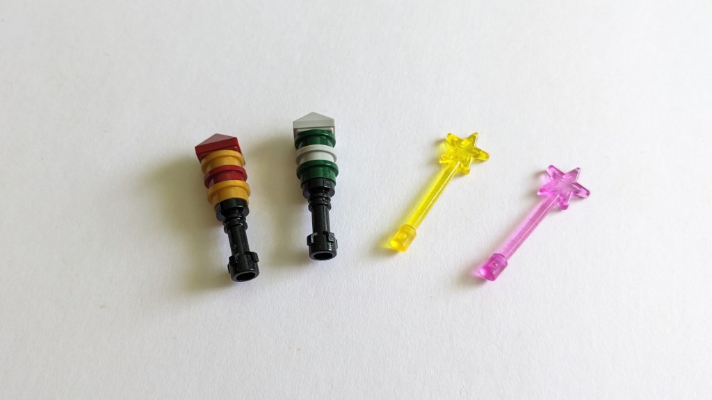 I like the two brick built rockets, which have the colours of the Gryffindor and Slytherin houses respectively. The many spares allow you to build another rocket, should you want one…
