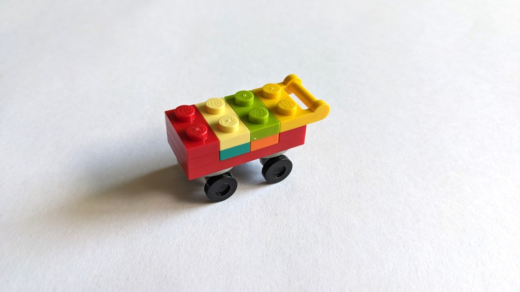 Not surprisingly, today’s model is also from Zonko’s (based on colour scheme). It seems like a trolley with with goods on it, but it is a lot harder than yesterday’s model to identify exactly what. It could be stink pellets, love potions, who knows. But whatever it is, we got heaps of parts.