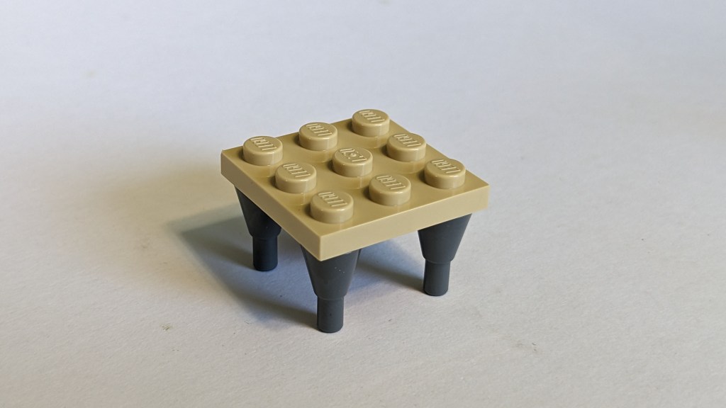 With 14 parts (two are spares today), it is not as big as yesterday’s fireplace, but still a decent size. As seen below, the model consists of a table with a lamp and Christmas decoration (I think – rather than some cherries to snack on) along with a chair. The table has an interesting design with the grey ice cream cones used as table legs.
