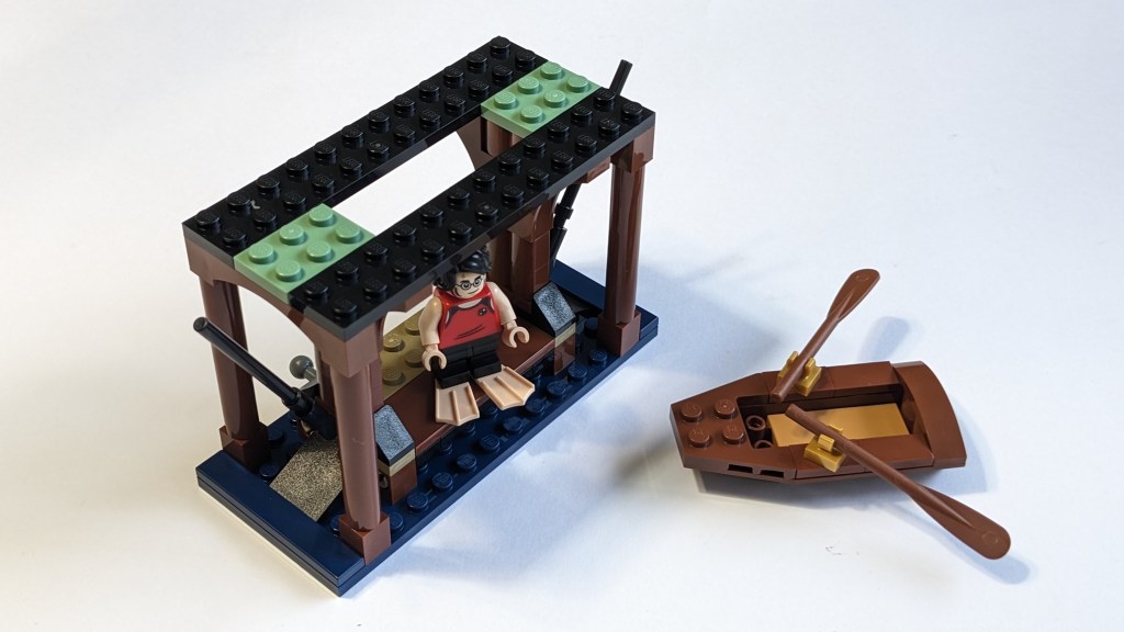 The first two bags are used to build the above water part. Firstly, we build a small rowing boat. I don’t really know why (the originally 2005 set also had one, but while they are there in the moving, they don’t really play any part of the story). The first photo shows how you can press a lever and make Harry jump into the water.