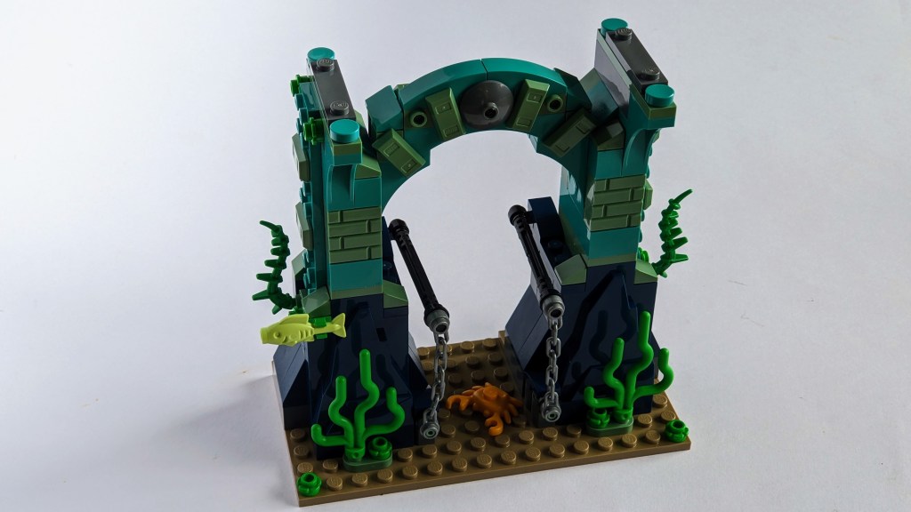 Bags 3-4 focuses on the underwater part. It is built on the loose plate from the box. The bottom part is dark blue tones (mainly) and has a mix of water plants and marine animals added. Above it, an arch is created using teal and sand green bricks. It looks quite amazing.