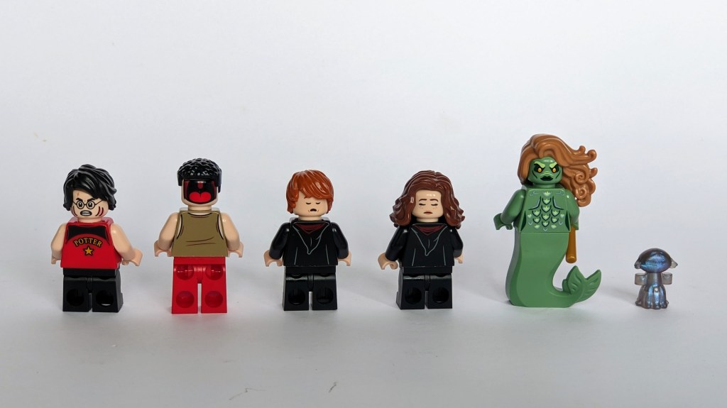 The included minifigures is an identical selection to the 2005 set, but the 2023 set includes a Grindylow, which is the first time in a Harry Potter set. The Grindylows are small, horned water demons living in the Black Lake along with the Merpeople.