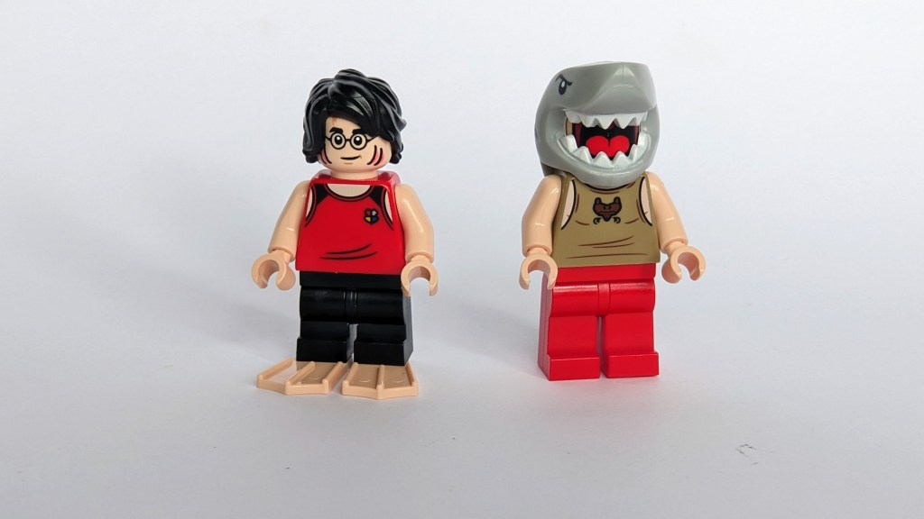 But the torso printing is great. Underwater, Harry was using gillyweed to allow him to breath underwater. That is what gave him gills. Viktor instead transformed partially into a shark. For this, the set include the shark head from the Shark Suit Guy from the LEGO Collectable Minifigure Series (CMF) series 15 some years back. That works really well.