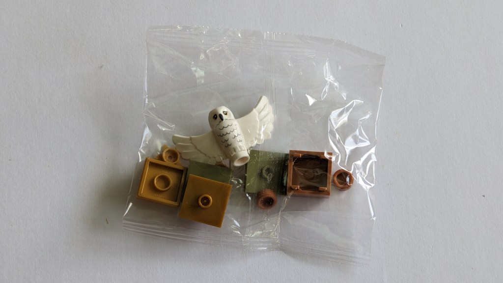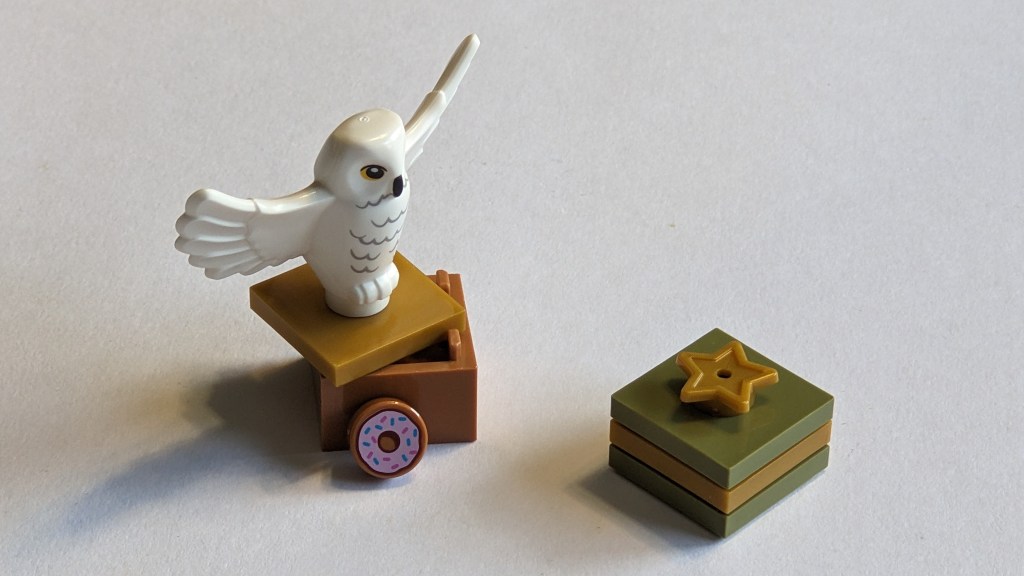 Hedwig is the nice version with spread wings we got a few years back. In addition to Harry’s owl, we got 9 parts of which two were spares. Looking at the parts, the box is pretty cool, as is the donut that goes inside it. And even better, there is a spare donut in the bag today.