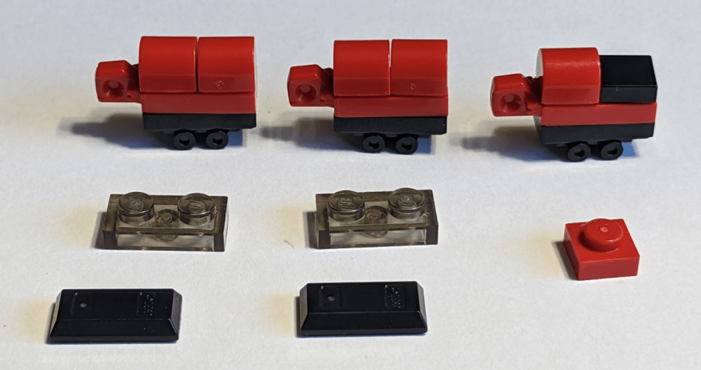 Below, I’ve illustrated an alternative version, with the bricks in front those I’ve used to substitute some of those used in today’s model. I think that is better, and uses just one more part (though slightly bigger ones). I may however be biased in my assessment…