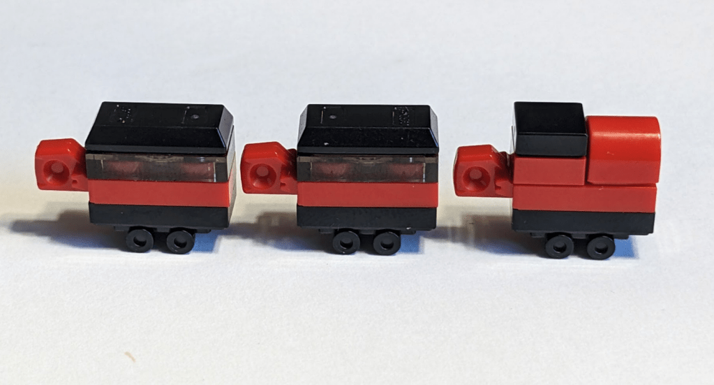 With the colours, it is easily recognisable, but somehow think it could have been improved maybe having black roofs for the carriages and having the small black tile on the steam engine being at the back to represent the roof there
